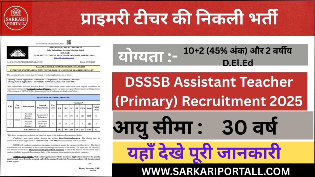 Delhi Subordinate Service Selection Board (DSSSB) ने Assistant Teacher (Primary) पदों के लिए DSSSB Assistant Teacher Recruitment 2025 का नोटिफिकेशन जारी किया है। इस भर्ती के अंतर्गत कुल 1180 पदों पर आवेदन आमंत्रित किए गए हैं। ऑनलाइन आवेदन प्रक्रिया 17 सितंबर 2025 से शुरू होगी और 16 अक्टूबर 2025 तक चलेगी। इच्छुक उम्मीदवार आधिकारिक वेबसाइट के माध्यम से आवेदन कर सकते हैं।