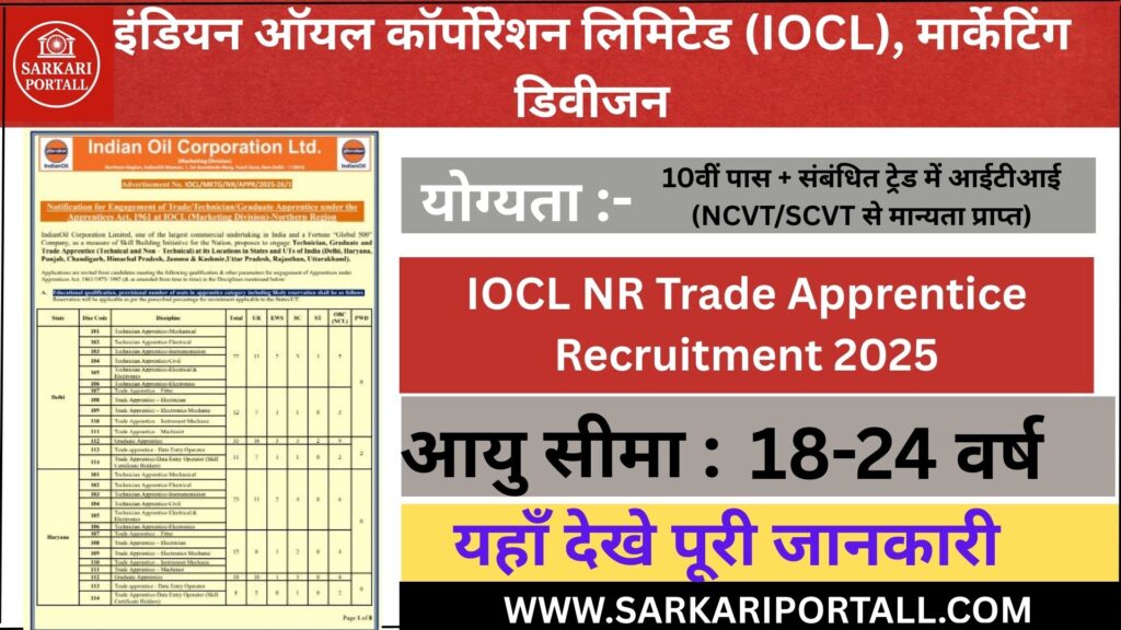 IOCL NR Trade Apprentice Recruitment 2025 इंडियन ऑयल कॉर्पोरेशन लिमिटेड (IOCL), मार्केटिंग डिवीजन ने उत्तरी क्षेत्र (NR) में 523 अप्रेंटिस पदों पर भर्ती के लिए नोटिफिकेशन जारी किया है। इच्छुक उम्मीदवार 12 सितंबर 2025 से 11 अक्टूबर 2025 तक ऑनलाइन आवेदन कर सकते हैं।