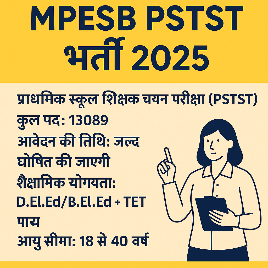 मध्य प्रदेश में शिक्षक बनने की तैयारी कर रहे युवाओं के लिए यह सुनहरा मौका है। मध्य प्रदेश कर्मचारी चयन बोर्ड (MPESB) ने प्राथमिक स्कूल शिक्षक चयन परीक्षा (PSTST) 2025 के तहत कुल 13,089 पदों परअतिथि शिक्षकों की भर्ती निकाली है